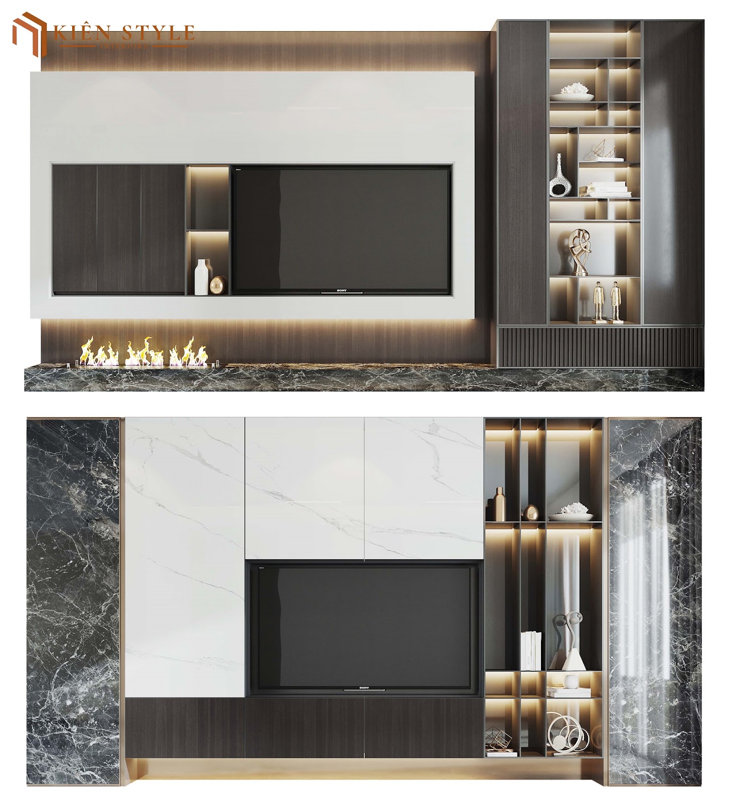 Dưới đây là một số hình ảnh thực tế của các mẫu thiết kế sáng tạo kệ TV từ Kiên Style Interior: