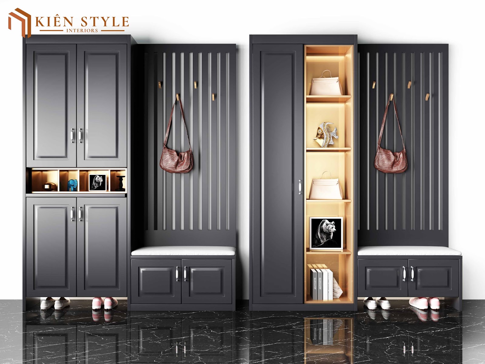Dưới đây là một số hình ảnh thực tế của những mẫu tủ giày từ Kiên Style Interior, giúp bạn nhìn rõ từng đường nét và chi tiết: