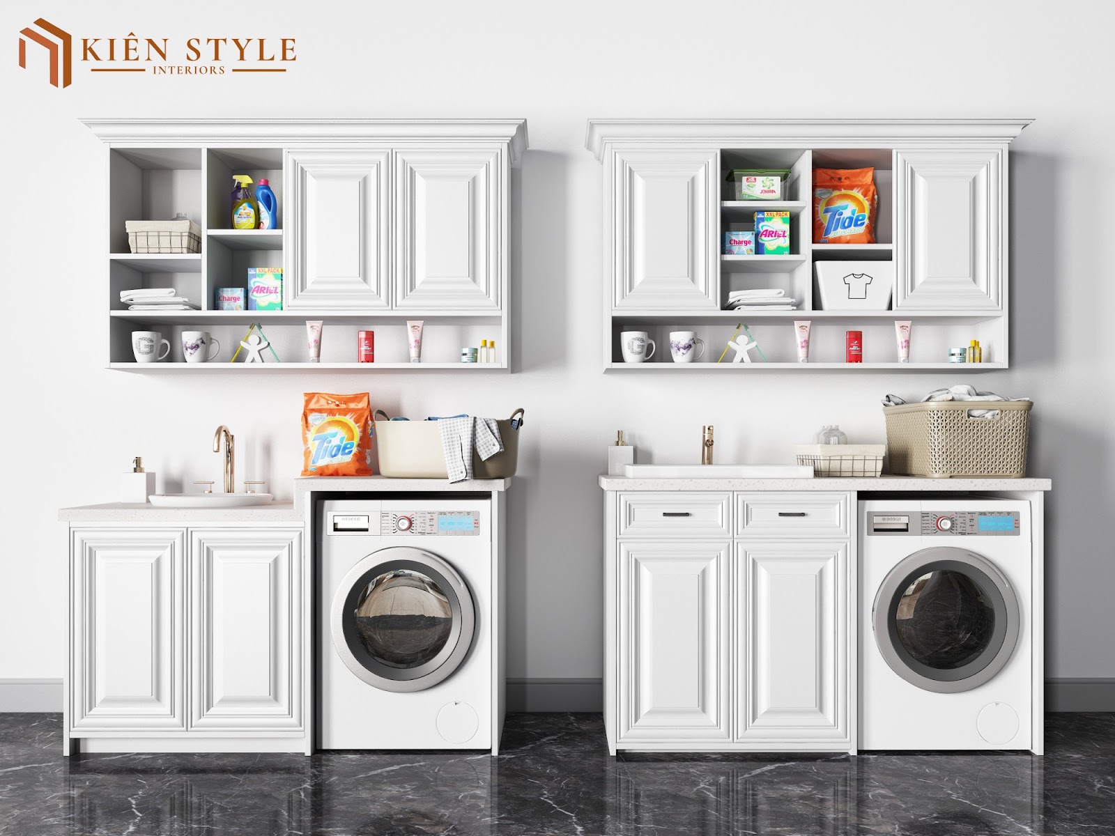 Dưới đây là một số hình ảnh thực tế của các mẫu tủ phòng giặt từ Kiên Style Interior: